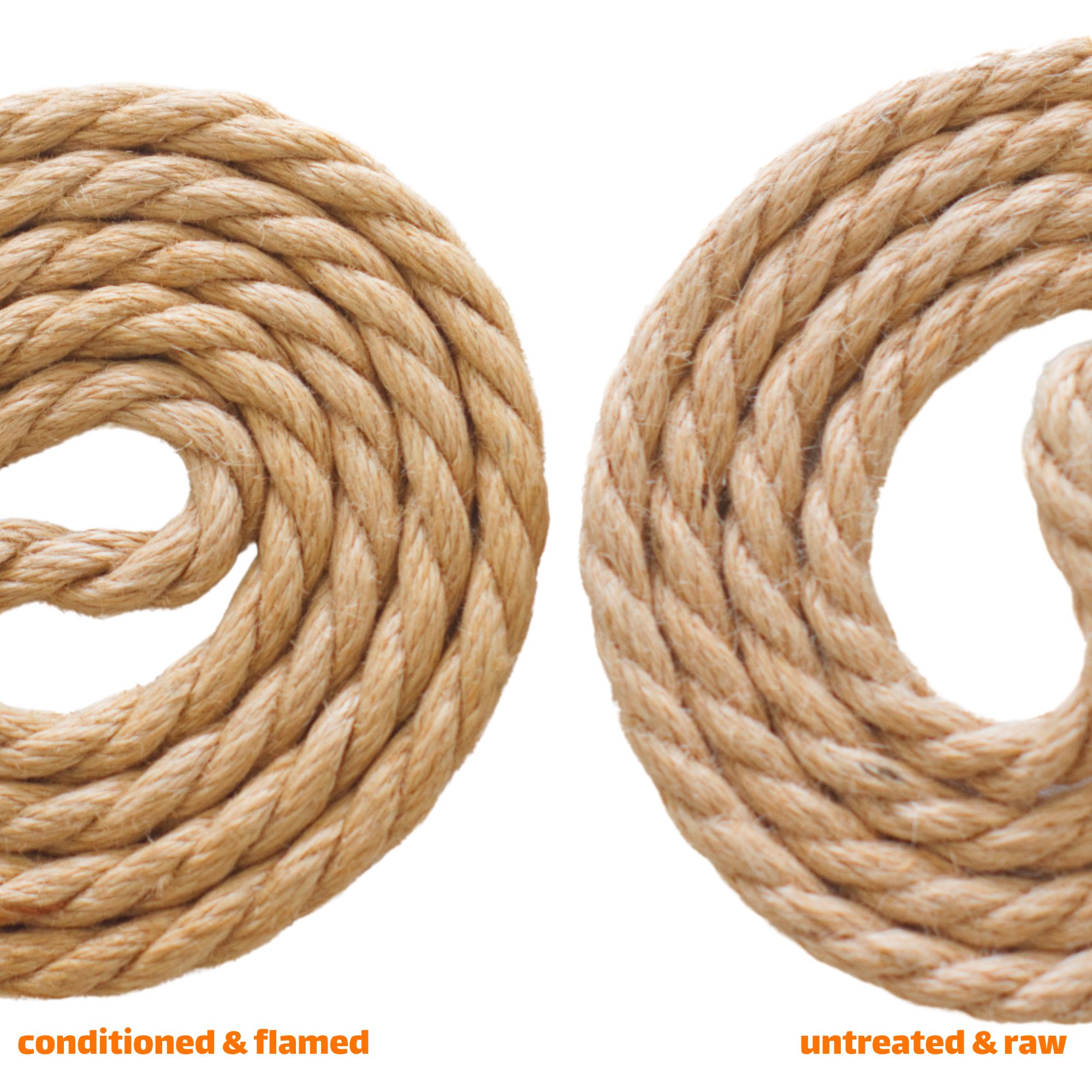 Light a gas flame and singe each rope meter by meter by pulling it through a blue (gas) flame. Move forth and back 2 – 3 times until any loose fibre has been burnt off. – ATTENTION – Loose fibres can ignite!!