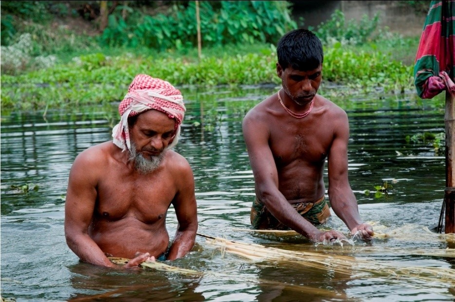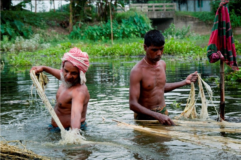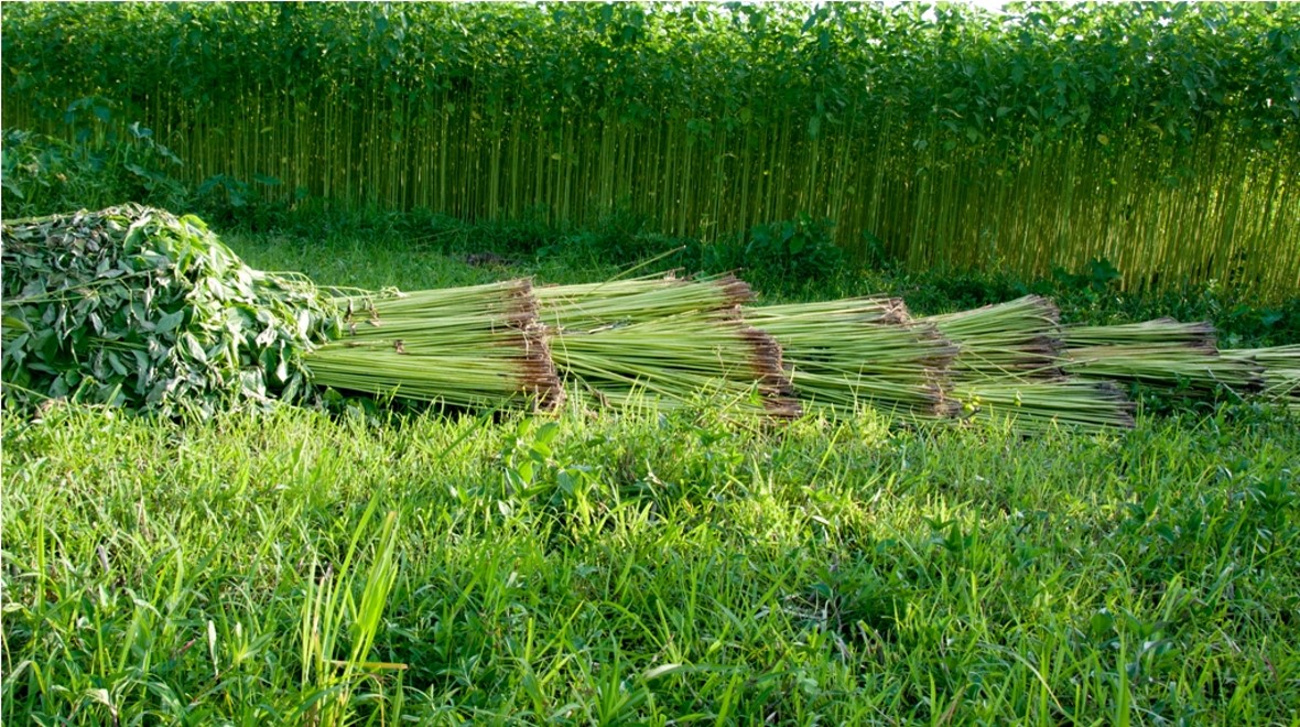 After cropping, stems are softened by retting in slow moving, clear water at 34˚C within 8 days, before bacteria or acidity compromise the filaments. If temperature varies >2˚C, this can double, and bacteria may be present. Fibre picks up contaminants from low water quality.