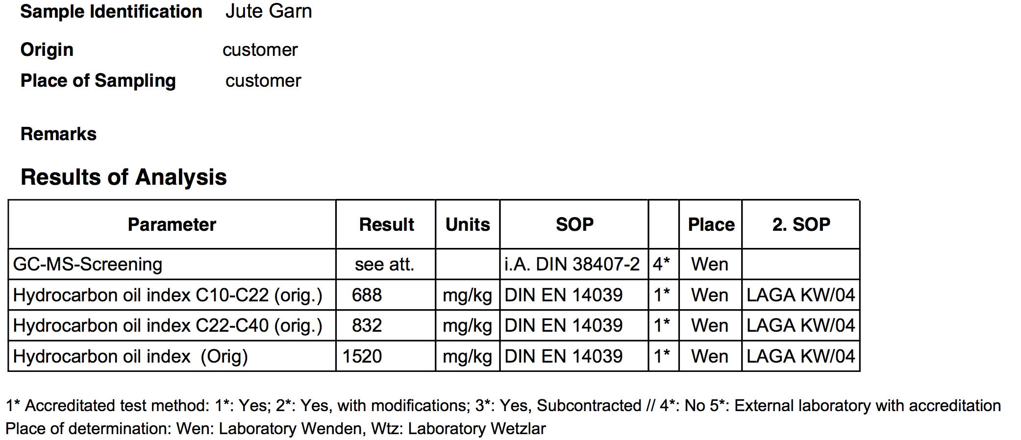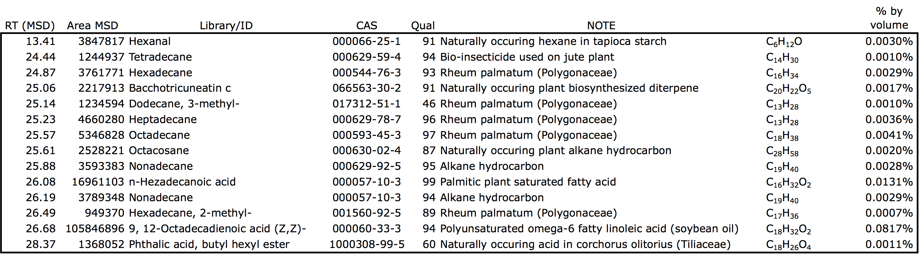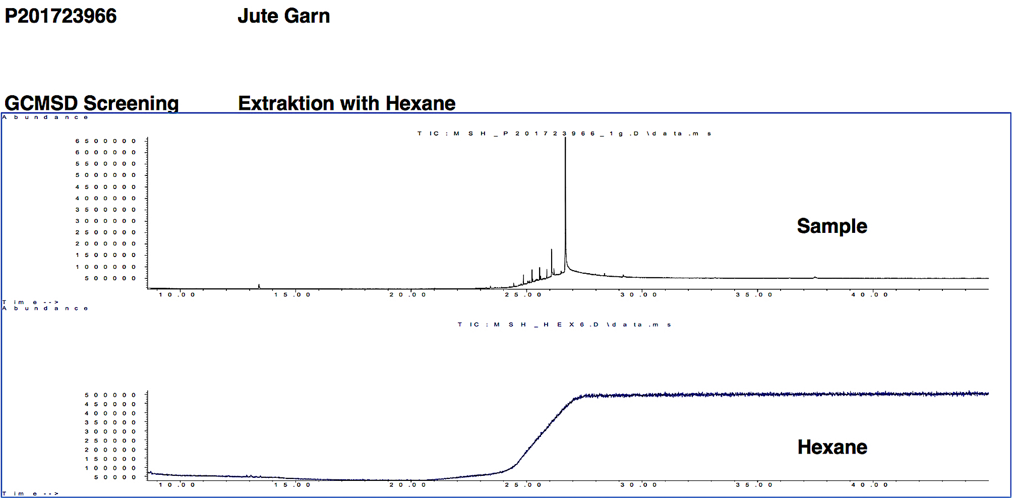 Gas Chromatography-Mass Spectroscopy results of Amatsunawa specification corchorus olitorius Tossa yarn batched without mineral oil (JBO), coated using Tapioca starch, used in our 27/30/33 product ropes.